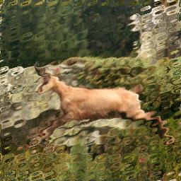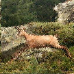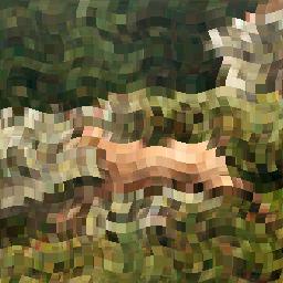 | Texture: This one is a bit complex; I actually used the source picture as a translation mask to that checkerboard (i.e. the red and green components of the source picture indicated how much I should move the pixels of that texture), and mixed the result to the weakened source picture.